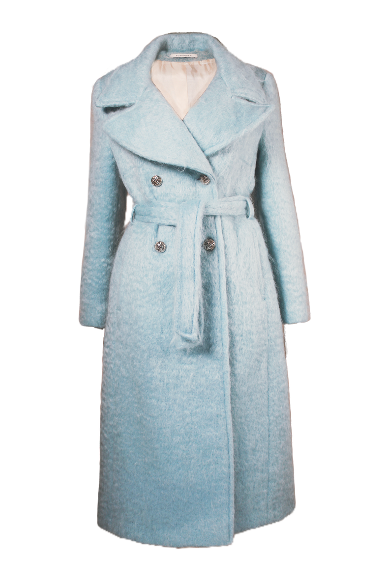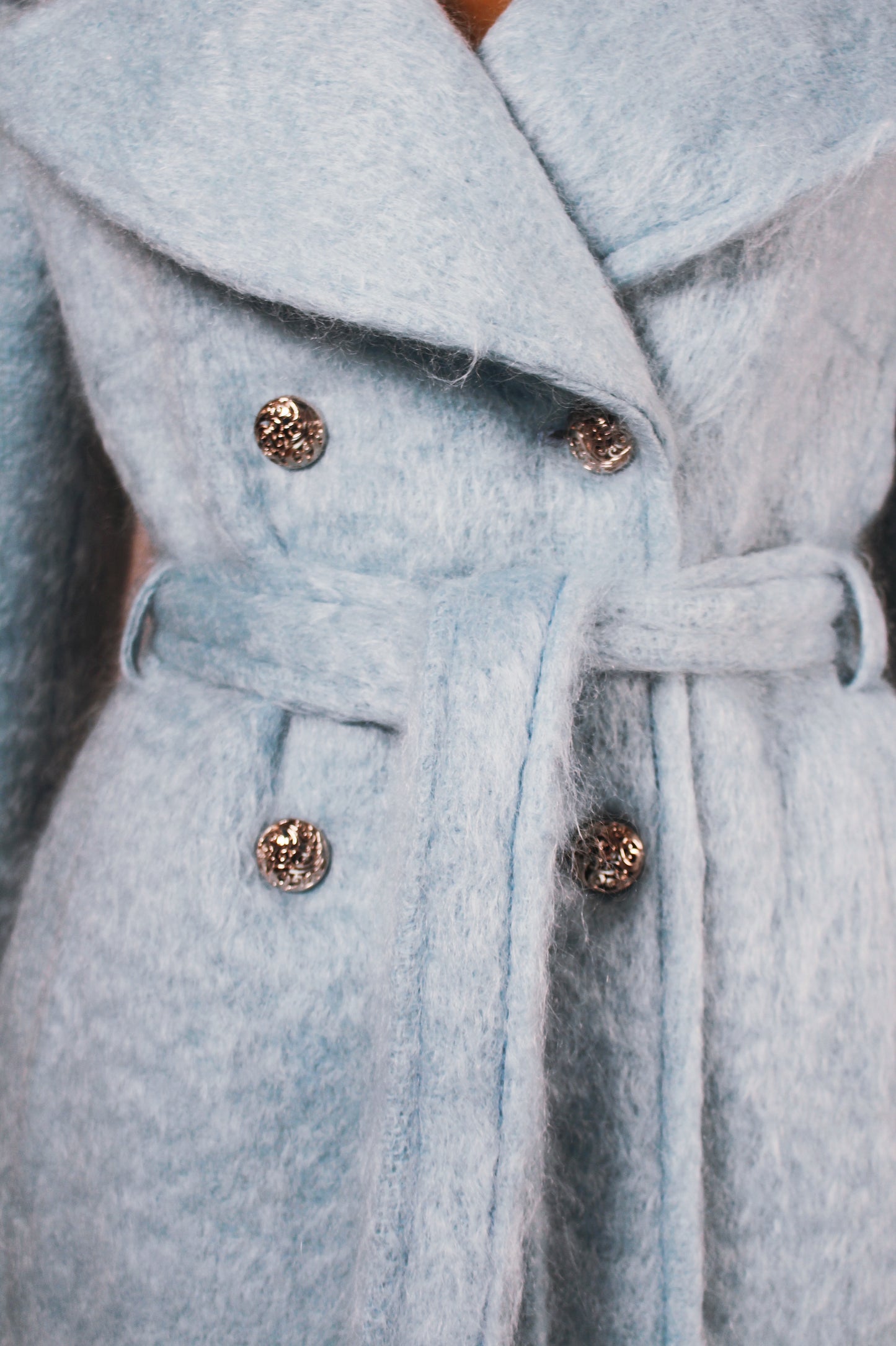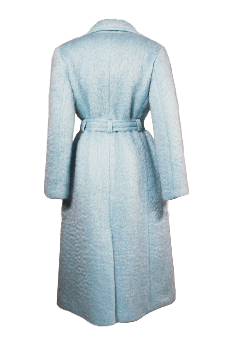 Indulge in ethereal elegance with our double-breasted mohair trench coat, a dream woven in the softest sky blue mohair. This exquisite coat embodies effortless luxury, featuring classic tailoring, ideal for those who appreciate unique and timeless design.