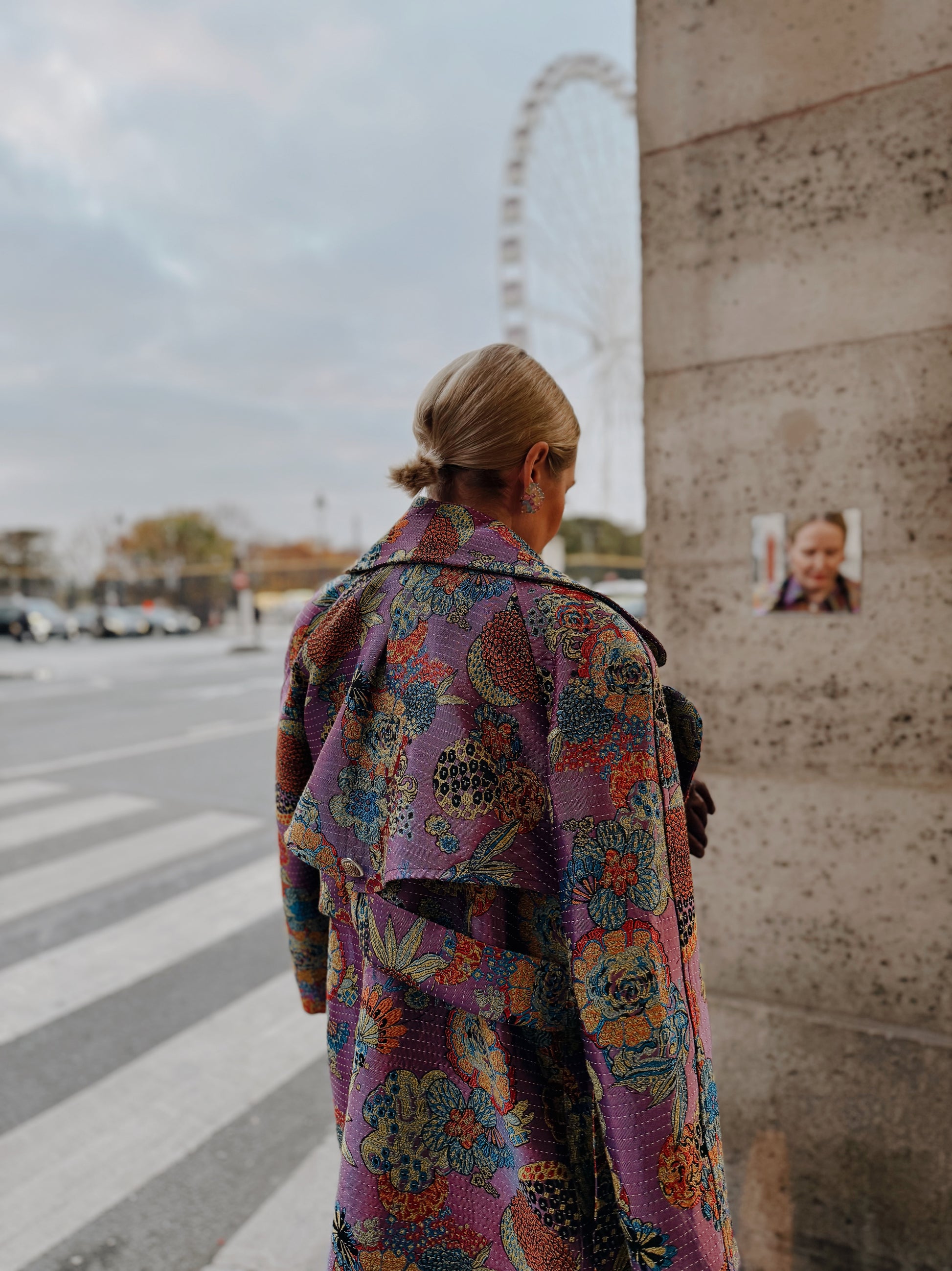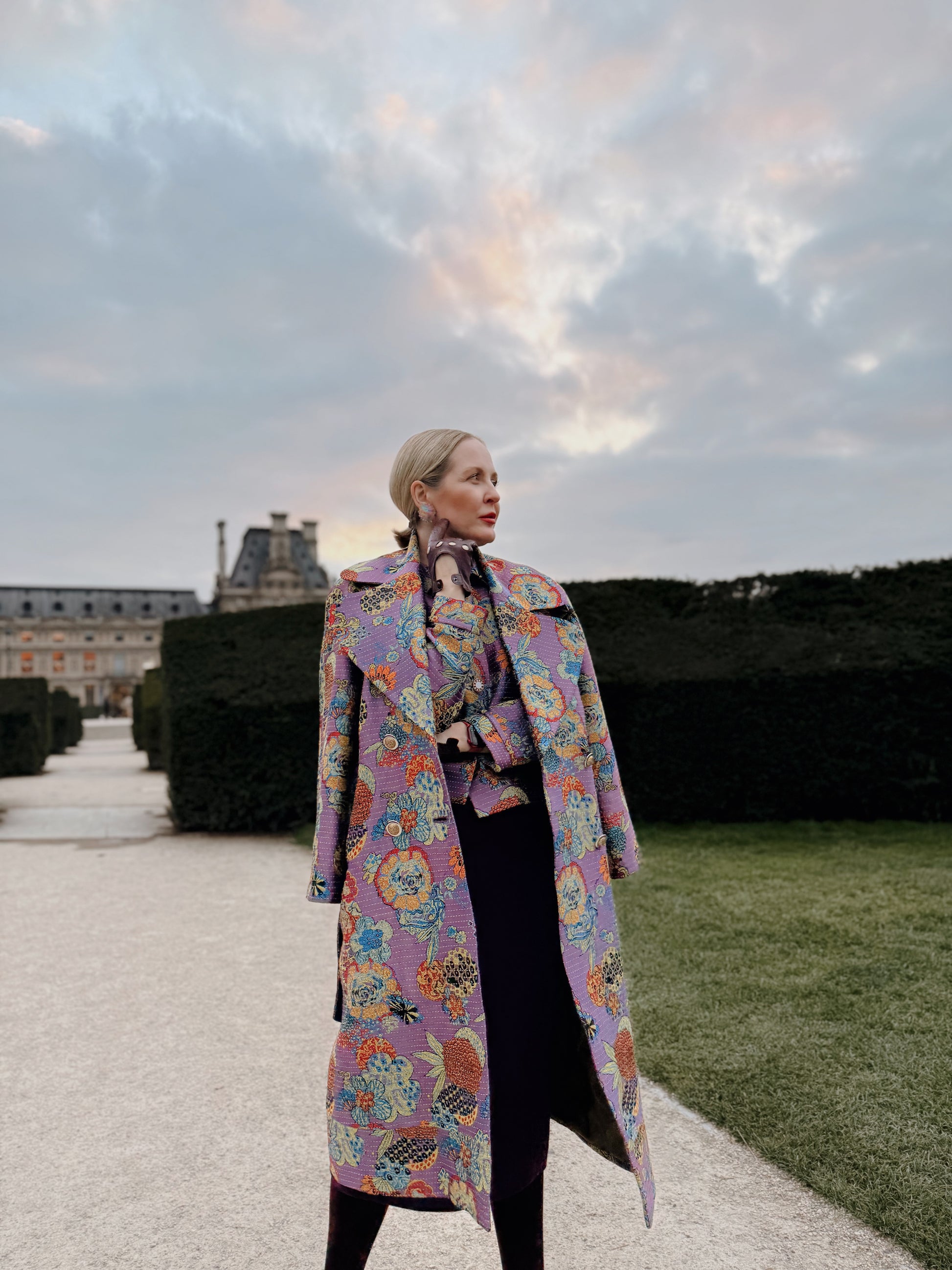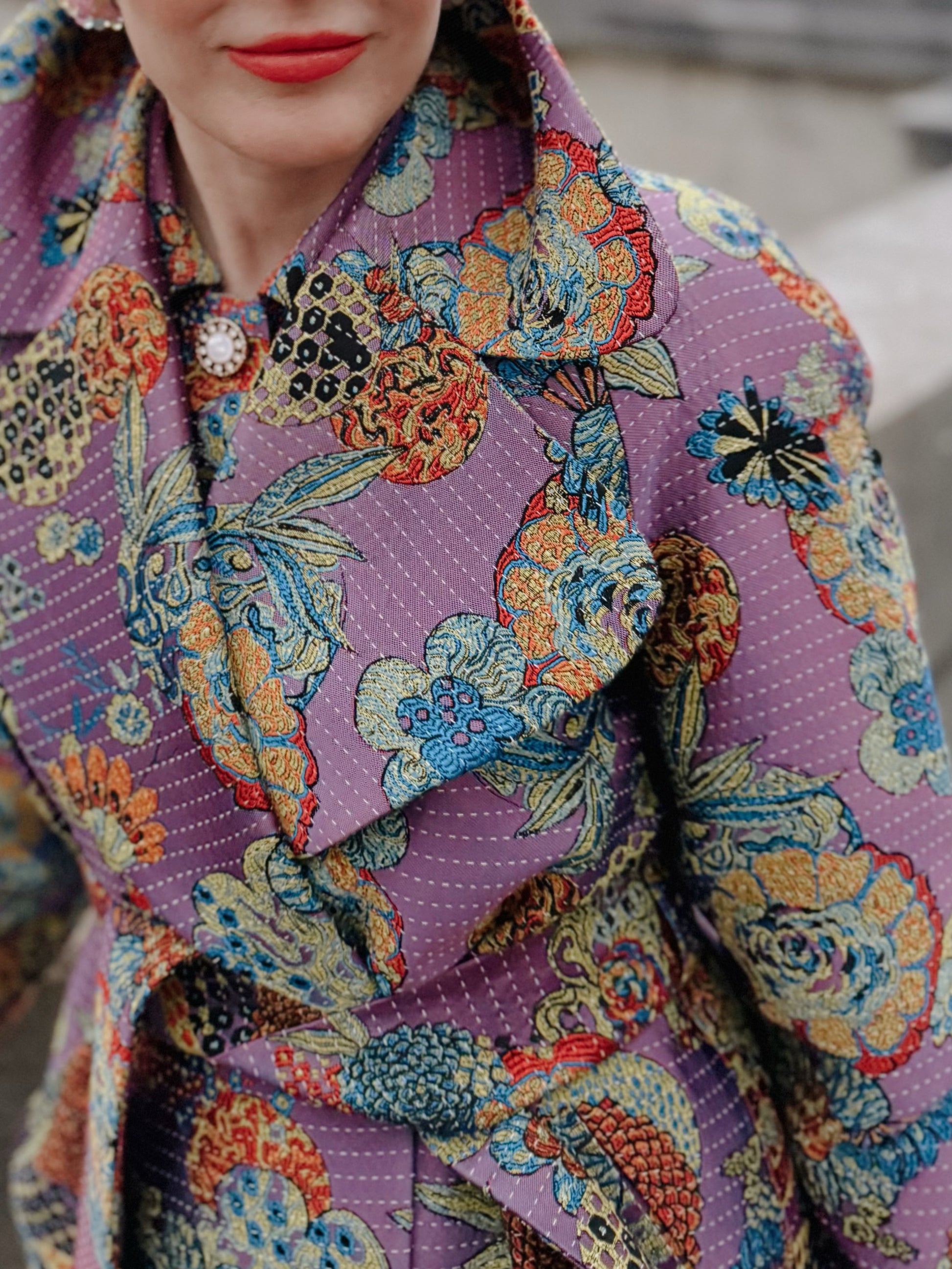 This handmade trench coat is a true statement piece, crafted from a vibrant jacquard weave. The rich violet base is beautifully patterned with flowers and ananas, while alternating horizontal yellow threads add a unique artisan touch. It is a timeless design with a modern twist, featuring classic trench details and a striking wide lapel. * Double-breasted * 4 metallic (silver&gold) buttons * Self-tie belt * Side slit pockets * Single back vent * Long, raglan sleeves (rolled up in pictures) * Fabric application inside the trench, applied to lining Fabric: 50% viscose, 41 %polyester, 6% cotton, 2% recycled cotton Lining: 100% viscose Please dry clean only For customisation please contact us via email at info@byplakinger.com |