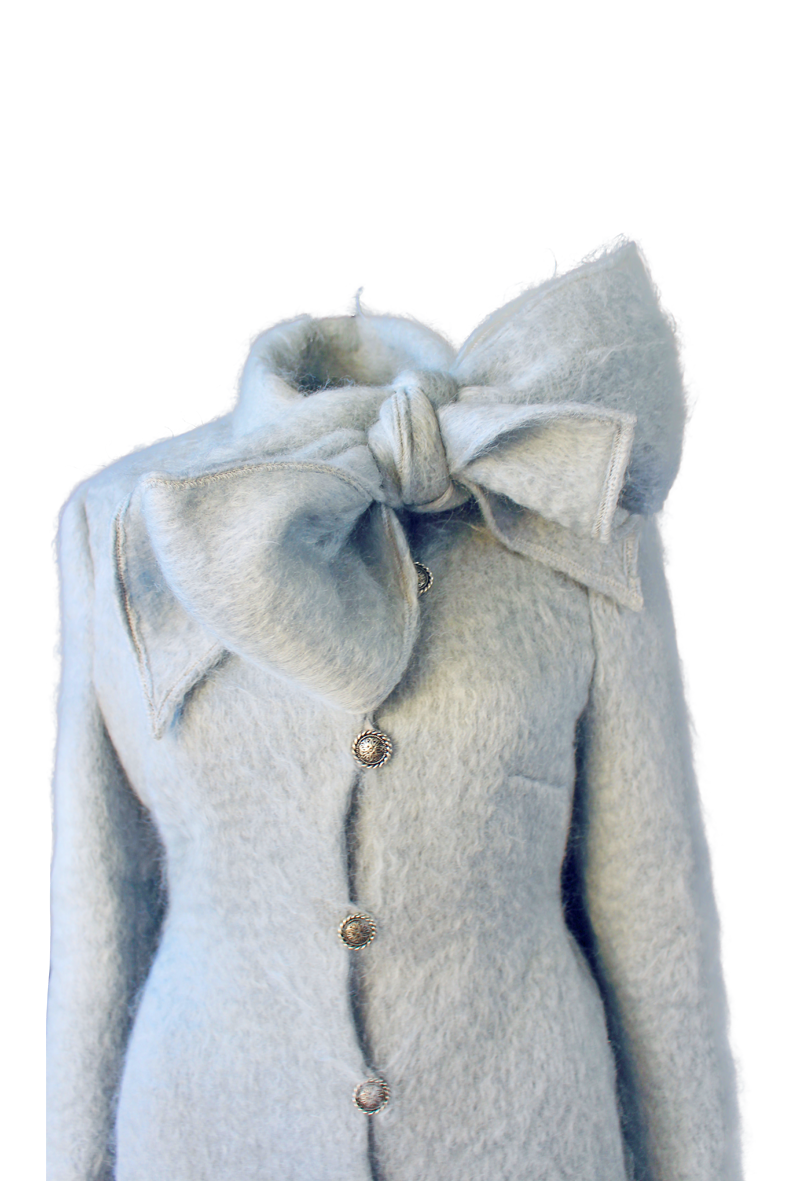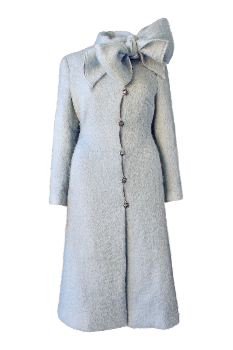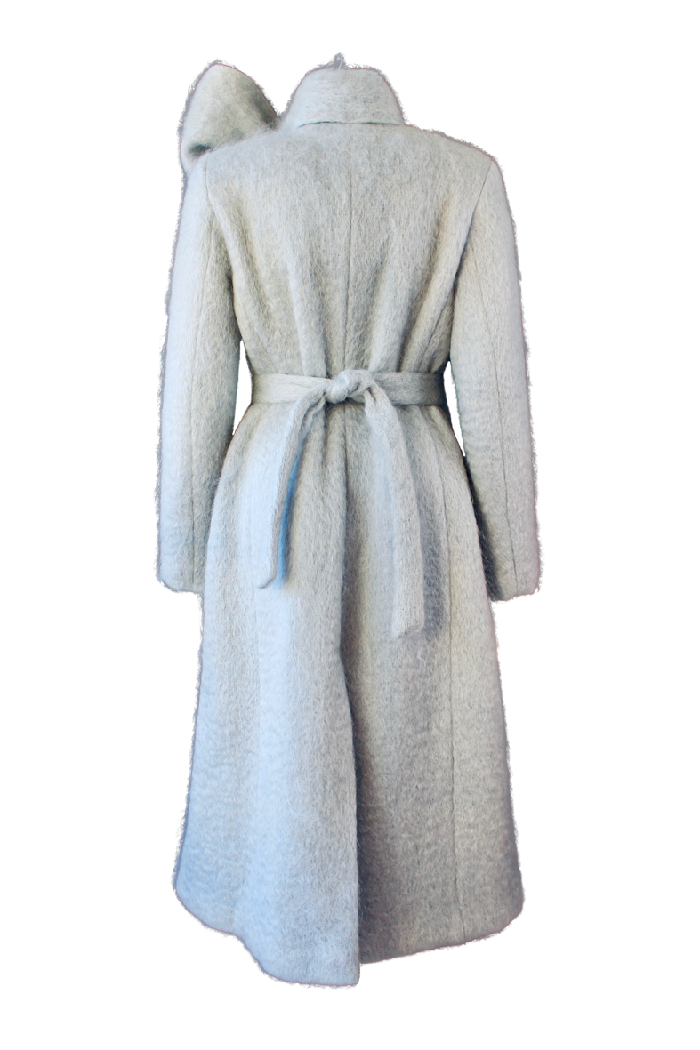 Indulge in luxurious warmth and undeniable style with our Grand Bow Mohair Coat. This impeccably crafted piece in a warm grey features a stunning oversized, self-tie bow detail that can be fashioned into a dramatic centerpiece or a cascading scarf, depending on your mood.